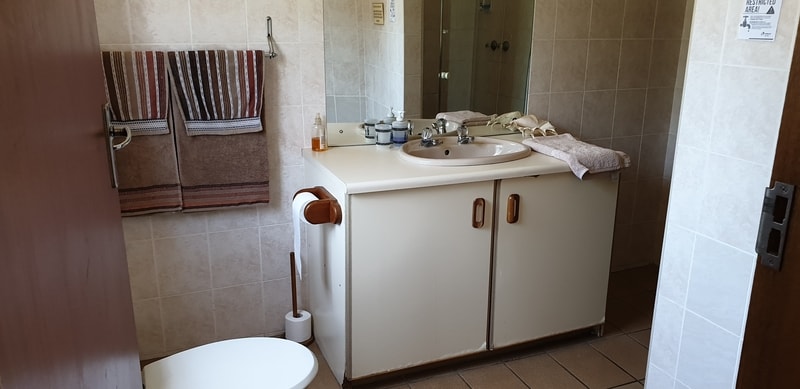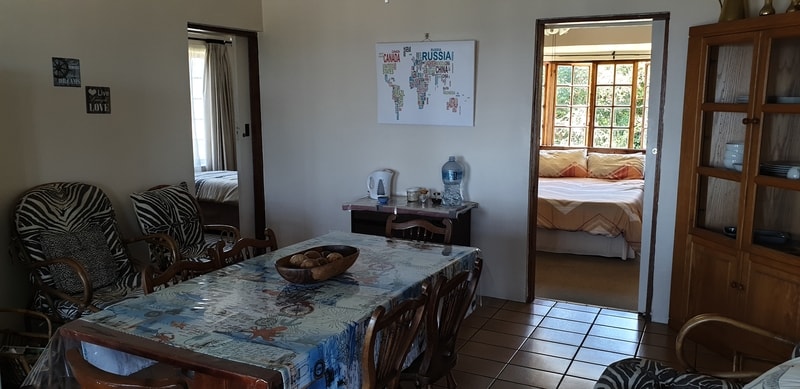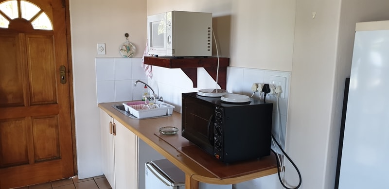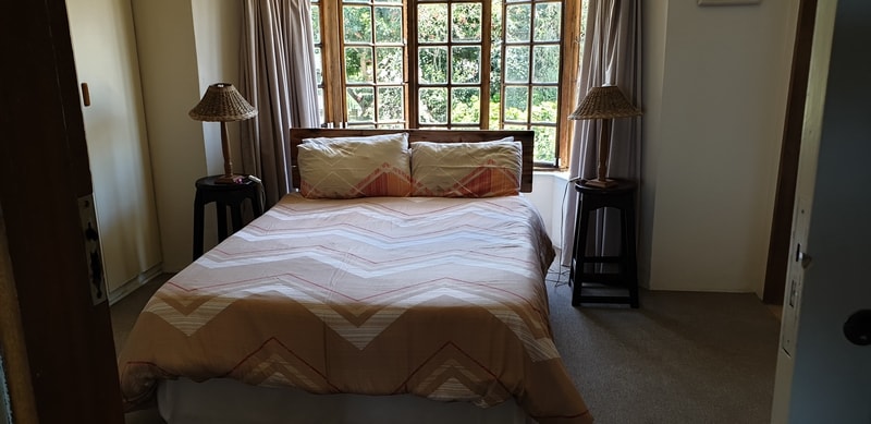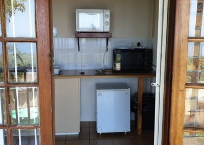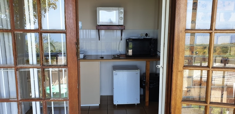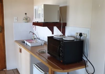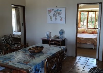 This is a double room with a double bed. It has a ceiling fan, en suite bathroom and DSTV. It shares a dinning/ seating area, kitchenette and a sea facing balcony with room 1. Standard occupancy: 2 adults. Price: R 880.00 per night.